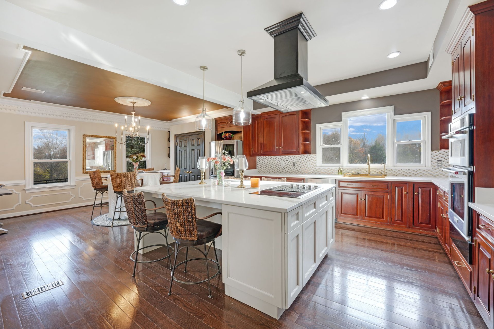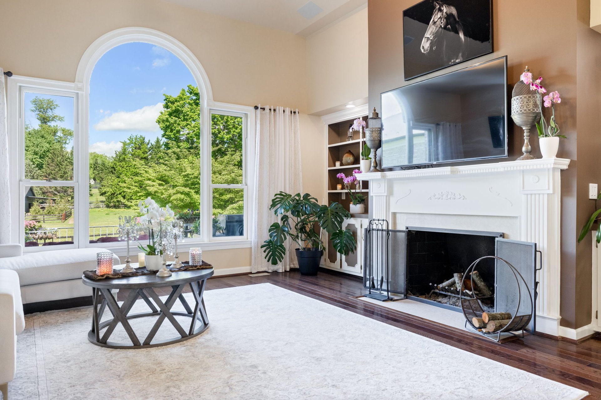 The heart of the home centers around a gourmet country kitchen that seamlessly flows into sun-drenched living spaces. The great room's gas fireplace anchors the space, while a magnificent Palladian window frames breathtaking views of the manicured grounds and rolling pastures beyond.