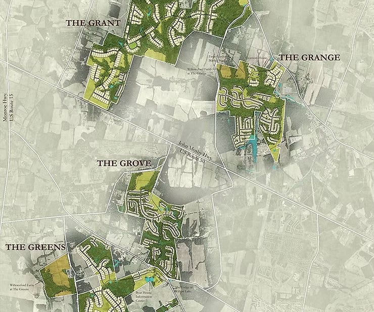 Willowsford is comprised of four distinct, separately located villages – The Grant, The Grange, The Grove, and The Greens. Each village has a slightly different character inspired by their natural setting, but all are interconnected within the framework of one overall community.
